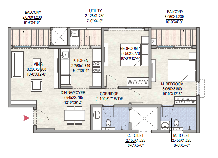 | 2 BHK + 2 T | 1,190 sq. ft. – 1,240 sq. ft. | On Request |